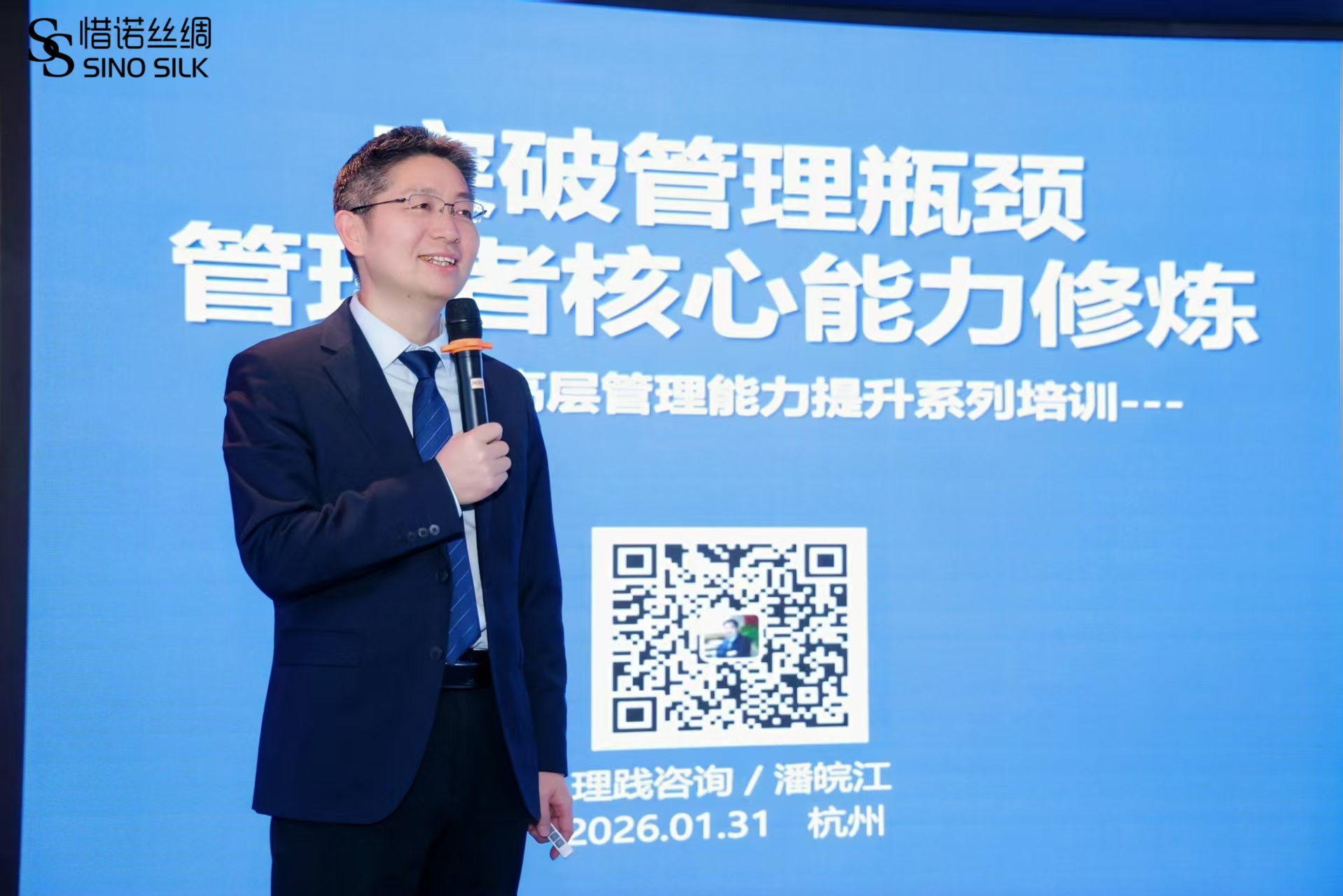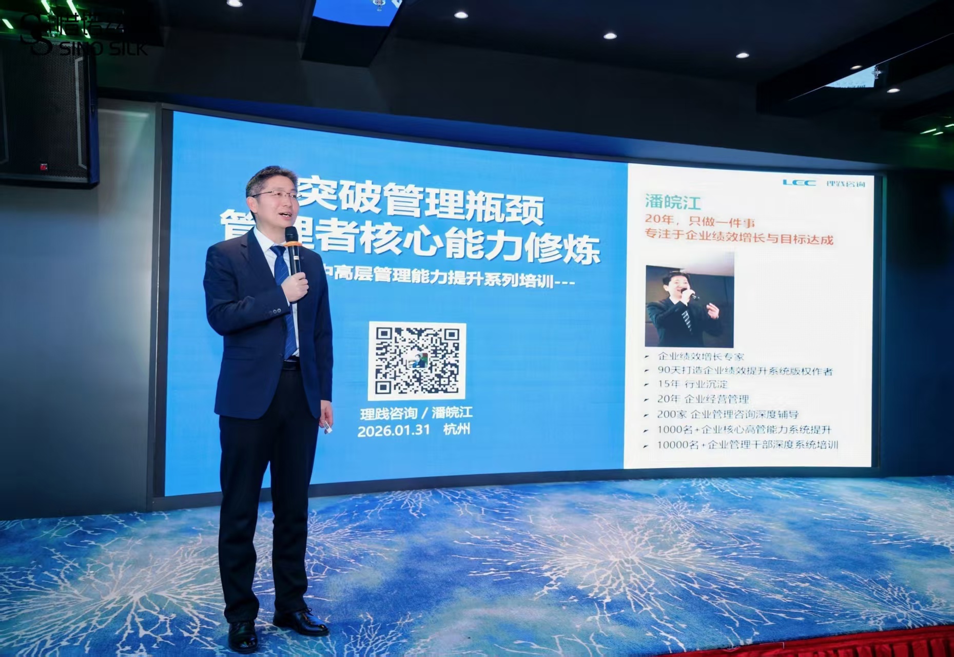 为了进一步推动客户企业绩效增长、目标达成,2026年1月31日,绩效增长、目标达成专家、理践咨询潘皖江老师应邀来到杭州惜诺丝绸,作为该企业年度高级管理顾问,参加该企业2025年度总结暨2025年会盛典,并以“突破管理瓶颈-管理者核心能力修炼”为主题进行专题分享,客户企业总经理、副总经理、各部门主管以及全体人员一起参加。